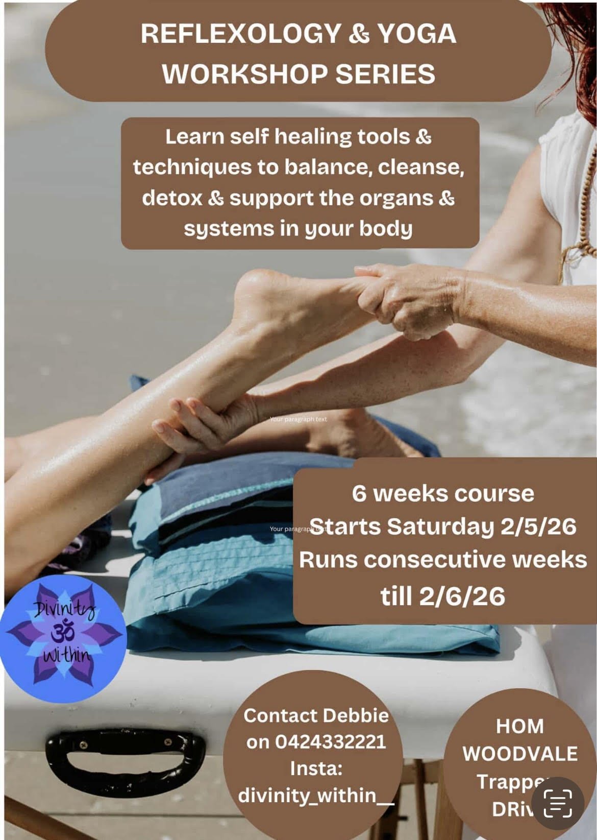 Join Debbie Hindley for a special workshop series where she will guide you in learning how to support and heal your body through the modalities of Reflexology and Yoga.